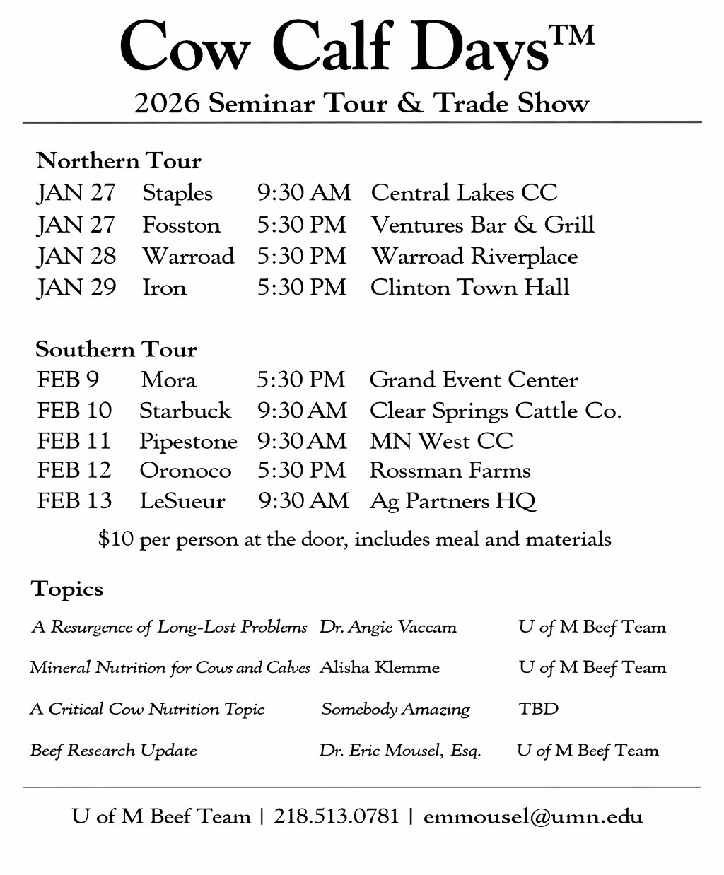 Make plans to join us for the annual Cow-Calf Days Seminar Tour and Trade Show at multiple locations across the state, hosted by the University of Minnesota Beef Team.